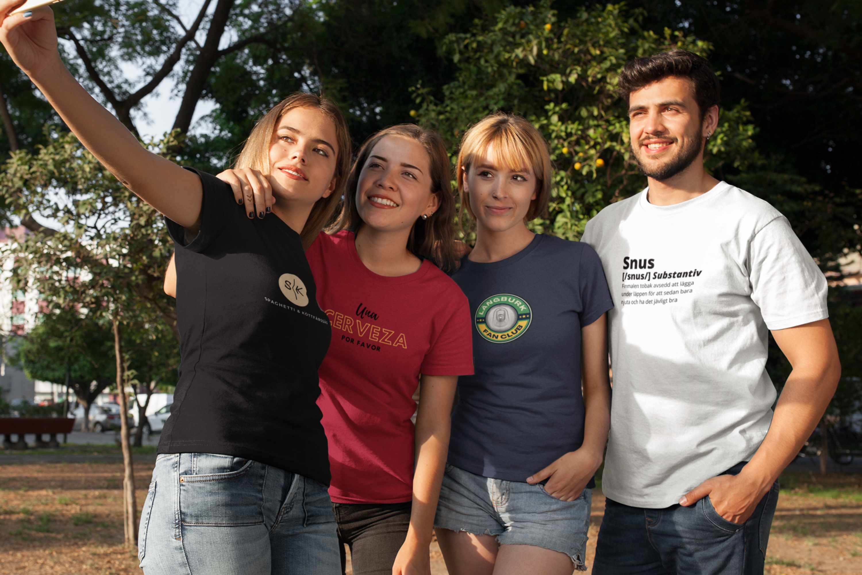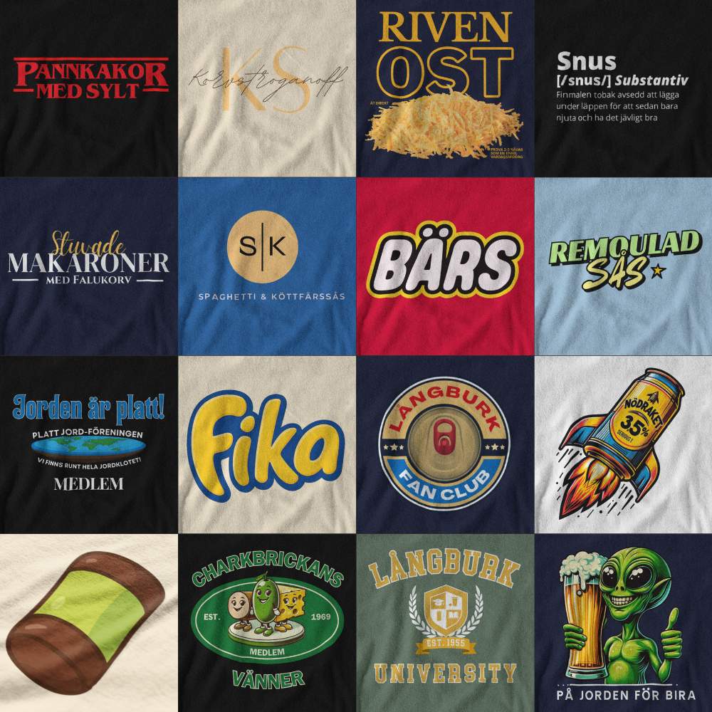 Utforska våra t-shirts med motiv som hyllar allt vi älskar med den svenska sommaren: grill, kalla bärs, jordgubbar, kräftskiva och mer!